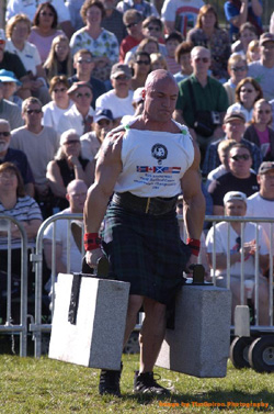 My next comp was a pro-am was put on by Art Mcdermott at the Highland games World championships. This comp was special for me because I was to be the only lightweight in a field of heavyweight pros and amateurs. The line up was Dan Ford, Walt Gogola, Grant higga, Jim Glassman, Derek Hurley and a bunch of other great competitors. I ended the day placing 2nd overall to Dan Ford only missing first by 1 point which would have been there had I completed 1 one rep in the log press (that sucker was awkward !) Even though I placed second, this was my most proud finish to date.