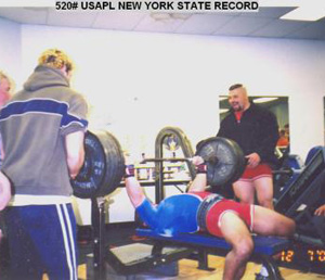 SENIOR: I benched 490@ 181 Dec-01 527@198 March 1, 2003 440 raw bench@ 196. The 490 & 527 are New York Usapl Records and the 440 is an ADAU American Raw record. I also hold the Wnpf Submaster American record with a 500 bench @ 196.