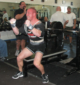 Jay Fry: I get so much speed from all the bands and the shirt that lockout training just isn't necessary. The flat bench and floor press with variations of band tension make the bench press movement like a core lift. These two movements strengthen all of my weak links in just those two basic movements. This is what has worked for me. Some of the other best benchers do use those other movements but I'm very happy with the results that I'm getting by just doing floor presses and bench presses with bands and these movements have taken me to competing in the Arnold Classic bench meet in Columbus Ohio.