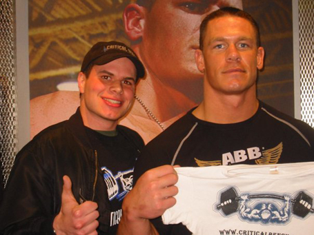 WWE Champ Superstar John Cena holds up a Critical Bench shirt.
