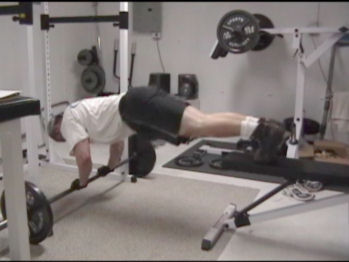 Anyway, for this one you'll need a barbell and a bench (or chair or whatever) and something to brace the barbell on. I'm using a rack to push the bar up against and that was the easiest but it can be anything solid. A wall won't really work because your body has to go forward over the bar a little ways.