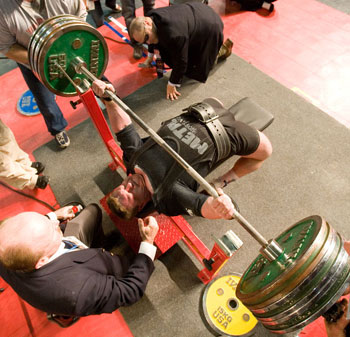 Lie down on the bench and unrack the bar as you normally would. Lower the bar to your chest and have a partner take note of the orientation of your forearms. For optimal power, your forearms should be as close to vertical at the bottom of the rep as possible. Adjust your grip accordingly and take note of where your hands are in relation to the smooth rings on the Olympic bar.