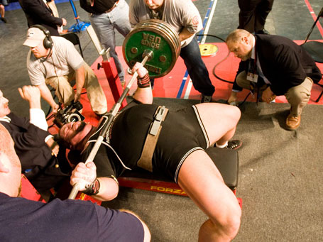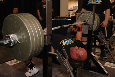 One last concept for your bag of tricks. George Halbert, one of the best Bench Pressers in the world, advocates the “Halbert Press” to learn to feel your triceps drive correctly and how to lower the bar with your lats. Set up with a 3 or 4 board on your chest, using a close grip. Lower it like you are trying to touch your stomach. With elbows tucked and bringing the weight low toward your feet rather than your head, you will feel your lats while lowering the weight and your triceps drive as you press back up. Try to remember this feel as you drive up those benches with your meet grip! If you have problems feeling this, try doing some one-arm pushups to get this feel. Then go back to the Halbert Press.