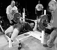 Power rack lockouts: This is where you lay under a power rack (the one you squat and shrug inside.) Set the pin to the 8 holes. Or the lockout pin that your rack has. When you do Rack Lockouts, you will be able to use a lot of real scary weight, possibly 250lbs over your raw bench. Some people can lockout insane weights but can't benchanything and vice versa.This gives you confidence to handle big weights and strengthens your tendons and lockout. Other options: you can set the rack from the 7 pins or 6 pin or 5 and strengthen your tendons and weak links from lower pins.