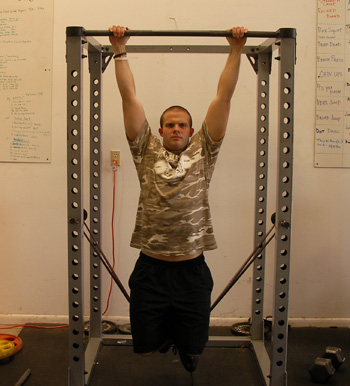 To perform a band assisted pull-up, take the squat rack pins and set them up at about hip level. Loop a band over each one so that the band lays parallel to the floor. Stretch the band down towards the floor and step on it with both feet. Grab the pull-up bar or the frame of the squat rack and perform a normal pull-up. The tension of the band will take some of your bodyweight off the lift and make it much easier for both very heavy lifters and new trainees who haven't built the necessary strength to perform a regular pull-up yet.