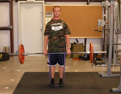 Loop a band around the middle of a barbell. Stand on the opposite end of the band. Reach down and grasp the barbell in both hands about shoulder width apart. Bend at the knees and lift the bar from the ground to waist level. Be sure to do the lifting with the legs and keep the back tight.
