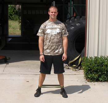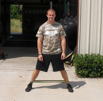 To perform band X walks, take 1 band and fold it on itself to make a double looped circle. Put the circle on the floor and step into it. Pick the band up and put it around your knees or your ankles. Now make long strides shuffling back and forth laterally. The movement should be wide and your body should be moving right to left while you are facing forward. This particular exercise is great for a warm up for a lower body training day. It greatly increases the activation of these muscles and gets the blood flowing.