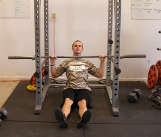 To perform band pulldowns with a barbell, take two equal bands and suspend them from the top of the squat rack like you would a reverse band bench press. Suspend a barbell in the bands and tighten/loosen the corresponding bands to get the bar to sit straight across the bands and perfectly parallel to the floor. Sit down below the barbell and reach for the bar and pull the barbell down. Pulling with the elbows and focusing on the contraction of the muscles in the upper back will allow you to get the most out of this exercise. Since you are using two bands for resistance in this exercise you maybe finding yourself floating up off of the floor. To remedy this have somebody lay a plate or dumbbell on your lap while doing this. If that doesn't work too well you can take another barbell and lay it across the bottom of the rack and take the safety pins and set them at about the level of your knees while slightly bent. Take that second barbell and place it underneath the safety pins and the barbell will act like a knee pad on a normal lat pulldown machine.