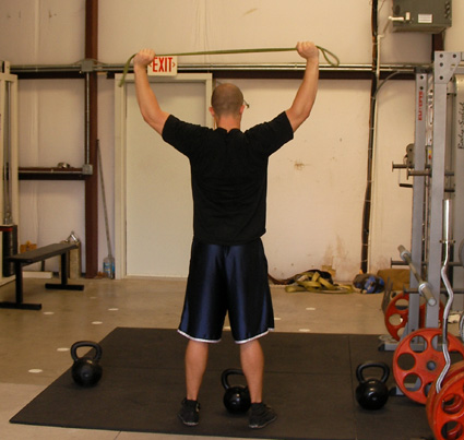 Grab each end of the band in each hand and extend your arms overhead. As in doing a pullup up motion pulldown the band behind your head and contract all the muscles in the back and squeeze.