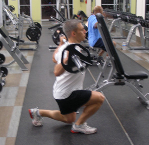 Step into the squat rack and adjust the pins so that you can easily clear the bar off. Position the bar on your lower traps and rear delts and lift the bar off the pins. Step back far enough so that you will be able to take a large step forward to perform this movement. Stand with your feet about shoulder width apart and take a large step forward with your right leg. As you are stepping forward, lower your body toward the ground until your opposite thigh is at least parallel to the floor. Once you reach the bottom, drive your body back up with the same leg until you are in a standing position. Repeat the motion with the opposite leg and continue to alternate until you reach muscular failure.