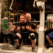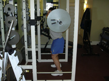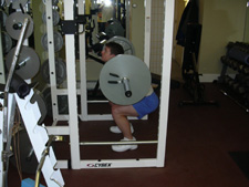 Tips: Squats are a big power movement and it is important that you use good form at all times. If you get sloppy by using momentum or twisting and jerking around you will be at high risk for an injury. Make sure that your abs are tight at all times and that your head is up. Your lower back should also be arched throughout the exercise rather than rounded out. When you reach the standing position, don't lock your knees out as this will stress the joints. I wouldn't recommend taking this exercise to all-out failure since you could easily hurt yourself. You should simply continue the exercise until you are one rep short of failure and then re-rack the bar. You should start out by using very light weights until you get a good feel for the lift and can execute it with perfect form.