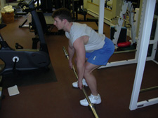 Using an overhand grip, hold the bar just inside of shoulder width. Pick the bar up off the ground and place your feet about shoulder width apart. Position your back so that it is slightly above parallel to the ground and full extend your arms toward the ground. Keeping your back flat and arched, pull the weight up to the area just below your rib cage. Keep your elbows close to your body throughout the entire movement and squeeze your back together as the bar touches your body. Hold the bar in the contracted position for a brief second and then lower the weight back to the starting position.