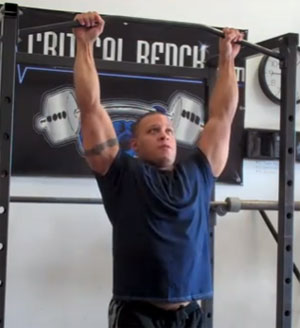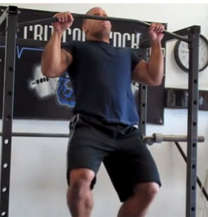 This is a chin-up but instead of focusing your strength on the 'up' part of the movement you'll be focusing on the 'down' part of the movement-the negative. Position yourself under a chin-up bar with your hands above your head, wider than shoulder-width apart.