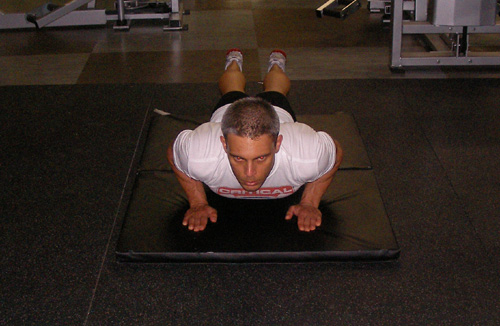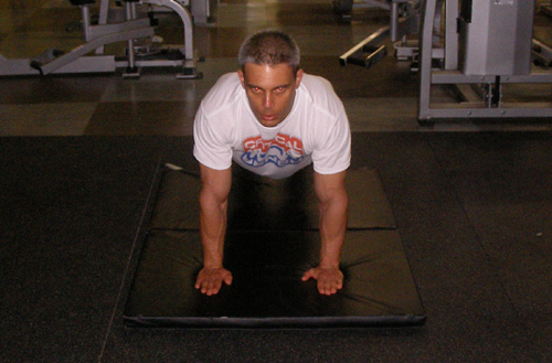By keeping your hands close together-about two inches apart-the traditional push-up emphasizes the triceps. To do this exercise, lie on the floor with your feet together and your hands flat on the floor-thumbs facing inward. Keep your body straight and your elbows tucked in at your side while you push up until your arms are fully extended. Hold for a second and then lower yourself until your chest is about two inches off the floor and then repeat.