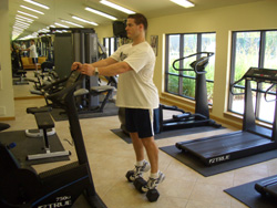 In the example the trainee is holding an exercise bike for balance. It is important that you do not cheat by using your arms to lift your bodyweight. To complete a repeition simply stand up on the balls of your feet contracting your calf muscles. It is okay