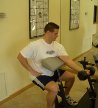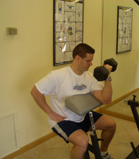 Using a preacher bench, hold one dumbbell in your right arm with your palm up. Support your arm and elbow against the pad and do not move them during the lift. Curl dumbbell up until the forearm touches the bicep. Lower to starting position using the same path. Finish set and switch arms. Can also be done with 2-arms or a regular barbell.