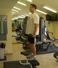 Tips: Keep torso upright during exercise. Stepping a distance from the bench emphasizes the Gluteus Maximus; stepping close to the bench emphasizes Quadriceps.
