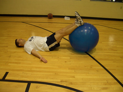 Lay on the floor in a supine position. Place the stability ball under your legs