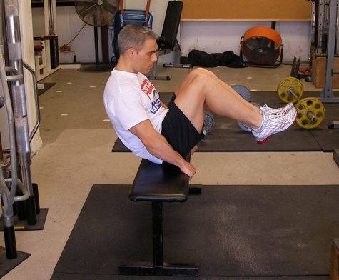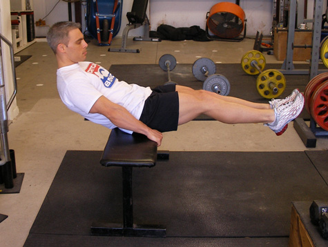 Sit across a flat bench with your upperbody leaning back and your legs fully extended out in front of you. Place your hands on the front of the bench to secure your body in place. With your lower back rounded, bring your upper body forward and simultaneously curl your legs in until your knees are touching your chest. Squeeze your abs in this position and then return back to the starting position.