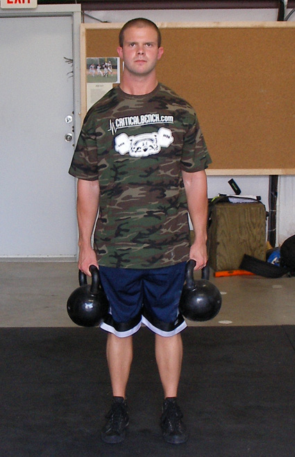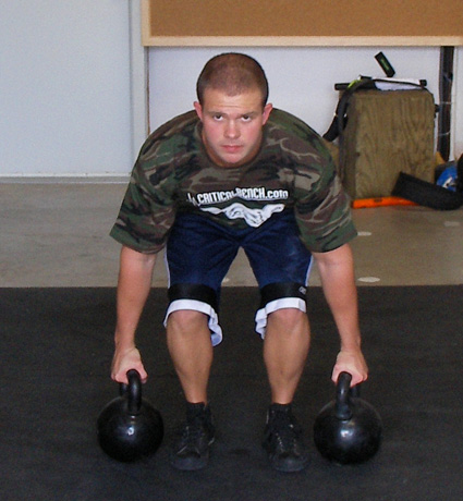 Stand with feet shoulder width apart and reach down and grab the handle of the kettlebell. Arch your back slightly and sit your butt back and lift the kettlebell up and close to your body. Finish the lift with the body erect and the kettlebell at your waist.