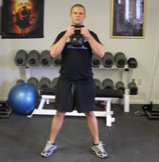 Stand with your feet slightly wider than shoulder width and hold the kettlebell by the handle in front of you with the kettlebell up against your chest. Sit your butt back and between your legs with your back arched until your hips are lower than your knee.