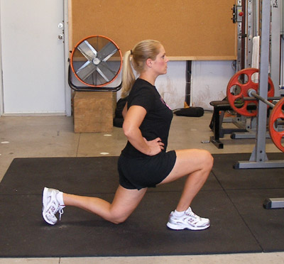 Begin starting with your feet hip width apart and then take a long step straight forward. Bending with both knees, lower your body until your back knee is within one inch of the ground. Pause and hold for 2 seconds, then raise your self back up. Repeat while keeping your back perfectly straight and concentrating on using those glutes and hamstrings to push yourself back up. Note: while you are in the down position, check to make sure your shin of the front leg is perpendicular to the ground. Try taking longer strides if your knee of the front leg is coming out over the toes.