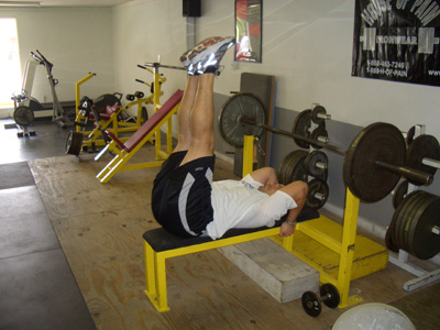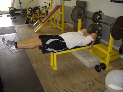 Lie on back with hands grabbing sturdy equipment or furniture behind head. Raise legs rapidly to a ninenty degree angle with your body. Squeeze abs for 3-count and slowly lower legs to floor.