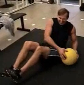 Your back should also be at an approximately 45-degree angle. To perform the movement contract your abs, raise your feel off the floor slightly and grasp the medicine ball.