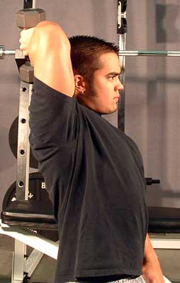 While seated on a flat bench, grab a dumbbell and lift it straight overhead. Keeping your elbow in place at all times, lower the weight behind your head until you feel a full stretch in your triceps. Pause briefly at the bottom and then drive the weight back up to the starting position, fulling locking out your elbow at the top. Repeat the exercise using the other arm.