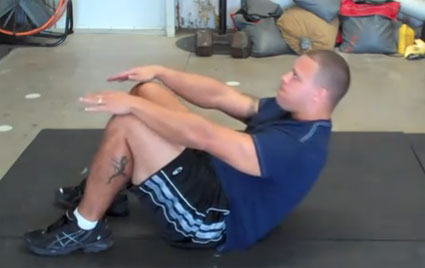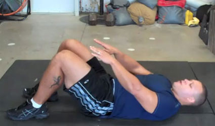 Next, raise your upper body off the ground in a crunch movement bringing your hands up and over your knees. Pause for a one count at the top, slowly return to the starting position and repeat.