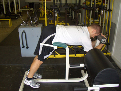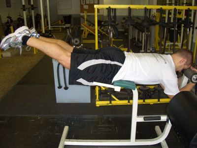 Lay face down on flat bench (the higher the better) with legs of bench. Grasp onto sides of bench for support.