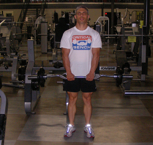 Grasp bar with a shoulder width over hand grip. With the elbows to the side, raise the bar until forearms are vertical. Lower until the arms are fully extended. Repeat. When the elbow is fully flexed, the elbow should only travel forward a few inches allowing the forearm to be no more than perpendicular to the floor to allow for a relative release of tension in the muscles between repetitions.