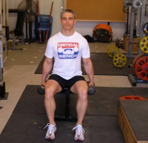 Sit on the bench holding a dumbbell in each hand. With your palms facing eachother, curl each arm one at a time by rotating your wrist so that your palm is facing in at the top of the movement. Pause briefly at the top, squeeze your bicep and then return the weight to the starting position. Alternate between arms until you reach muscular failure.