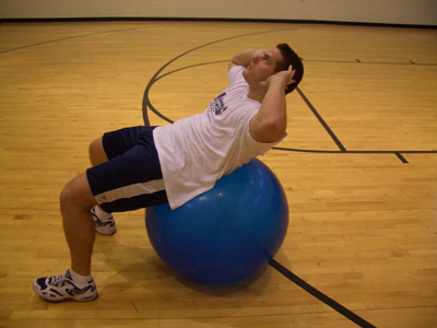 The stability ball should be between your hips and shoulders following the curvature of the spine. Arms should be folded accross your chest or you can put them behind your head. If you do place them