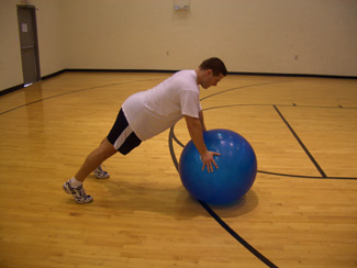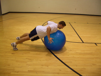 feet on the floor in a strong push-up position. Let your body drop to the ball making contact