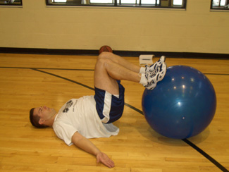 In a supine position on the floor position the stability ball under your legs between your knees and feet.