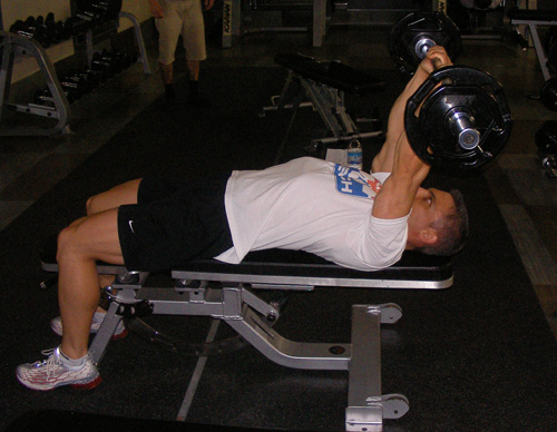 Tips: Using a full range of motion is very important on this exercise. When most people perform this lift, they simply bring the bar down until it touches their forehead. This limits the amount of muscle stimulation they can achieve since they aren't using a full range of motion. Make sure to bring the bar behind your head rather than simply touching your forehead. A spotter can be very helpful on this exercise by handing you the weight when you are in the lying position and taking the weight from you when you are finished. You can also perform this lift with dumbbells.