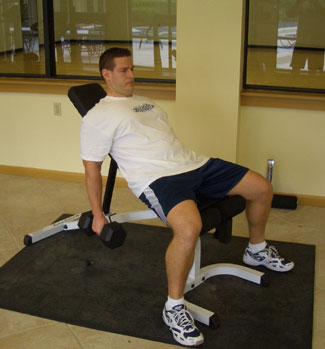 You're NOT going to sit on the seat of the incline bench as you normally would. First, pick up your dumbells and straddle the incline bench. In that standing position, move your butt all the way back onto the bench. Sit on the incline face of the bench then set your FEET on the seat of the bench (knees bent).
