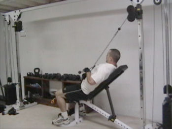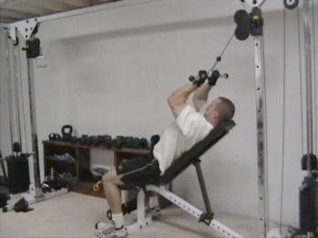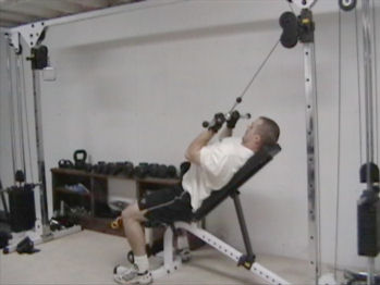 First, set an incline bench in front of a high pulley with the bench facing away. You can use any attachment with this - bar, rope, triangle bar, etc. Lay back on the bench and reach back overhead and grab the attachment.