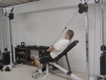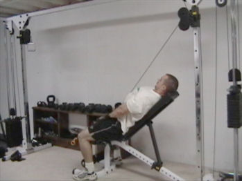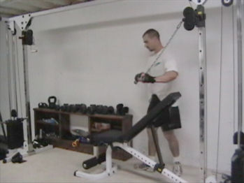 When performing this exercise, it can be helpful to use a length of chain (or extra cable) to extend the reach of the cable. With an extra 2 feet of chain, you can start the exercise from a lower position so you don't have to pull the weight down from overhead. Just use the cable and set the bar on the bench. Before you sit on the bench, grab the handle, bring it around in front of your body, then begin the movement.