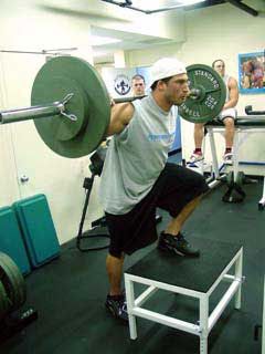 First, set the safety rails in the rack to about a foot or so off the ground. Set a barbell on the rails then load up a moderate weight. The first time you do it, start light to get the feel for the exercise, e.g. 25's to 45's on either side.