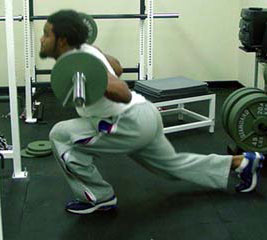 Now step your left leg forward into a typical lunge position stance. Go down into the lunge with the barbell resting on the back of your right thigh (your back leg, basically).