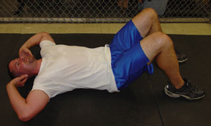 Lie flat on your back with your knees bent and your feet together flat on the floor and about 10-15 inches from your buttocks. Your hands should either be crossed on your chest, by your side, or cupped behind your ears.