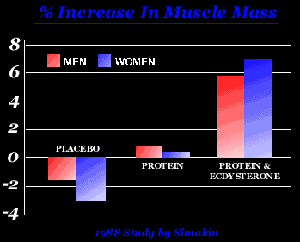 The most often quoted ecdysterone scientific study was published in Scientific Sports Bulletin by S. Simakin in 1988. The objective of Simakin's famous study was to determine the effect of ecdysterone on muscle tissue mass and fat mass, while testing for hormonal changes in the subjects. For the study, three control factors were used: a placebo, protein, and ecdysterone with protein. The results were significantly in favor of the third factor. Of the 78 highly trained male and female athletes who consumed just protein, they showed only a slight increase in muscle mass for the 10 day period of time. Those who used a placebo lost a slight amount of lean muscle, while those who used protein plus ecdysterone showed a 6-7% increase in lean muscle tissue with nearly a 10% reduction in fat! Let me say that again: A 10% reduction in fat and a 7% increase in lean muscle tissue in just 10 days! Safety testing was conducted during the same time period which showed no difference in hormonal balance. Wow, if ecdysterone plus protein can do this for highly trained athletes, just think what it can do for the average person!