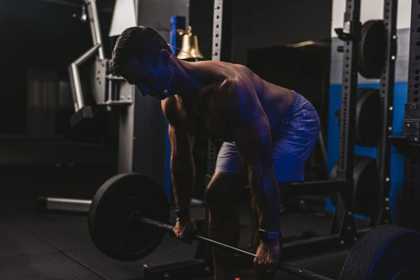 The lifter starts out in a crouching position, grasping the bar as it sits on the floor.