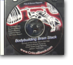 On this CD you'll find info on: how to put pounds of muscle on in weeks, not months. How to increase your bench press. How to grow your arms, get massive and--well, just about anything you want to do with your bodybuilding, you'll find out how to do on the Brain Stack CD.