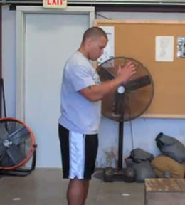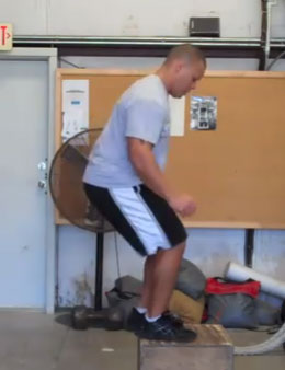 Position your body so you are standing in front of a sturdy wooden box or platform with your feet close together but not touching. Crouch down slightly and then jump up landing with both feet on top of the box.